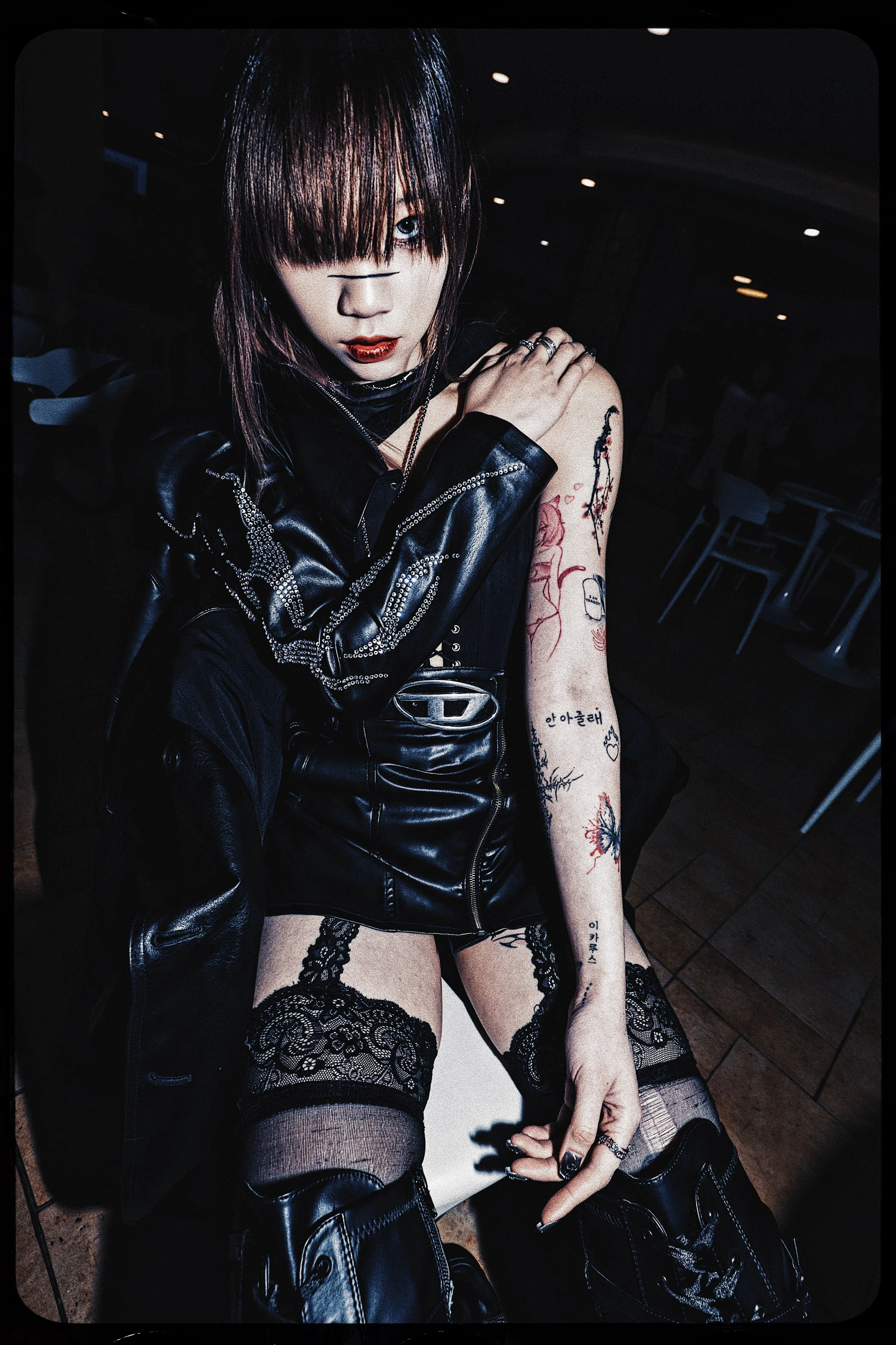 "Deadly Nightshade" we titled the second. We photographed @neko.ethiriel in black leather everything—studded bodice, raw-edged tattoos visible on pale skin, harsh strobe lighting cutting her from the fluorescent-lit food court backdrop. Fishnets paired with leather and lace creating pure underground energy. Androgynous features, threatening pose, gender-fluid presence transforming mundane space into industrial nightlife aesthetic.