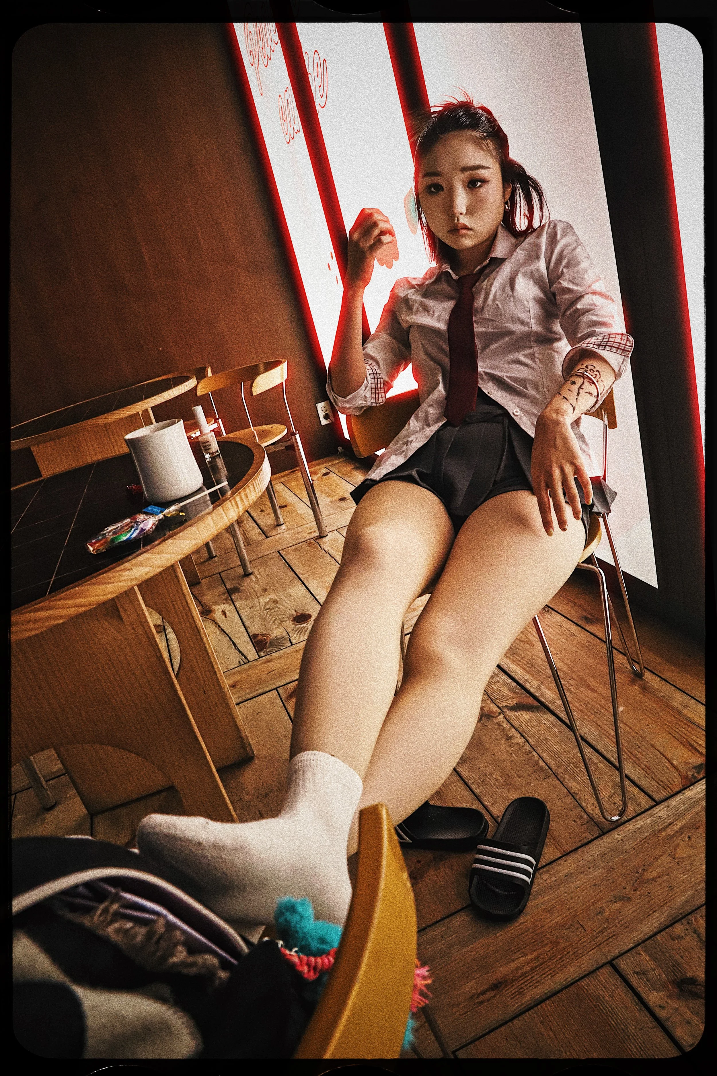 Model @sio_0_show takes up space in an Anguk-dong coffee shop in a way that is rude for her station.