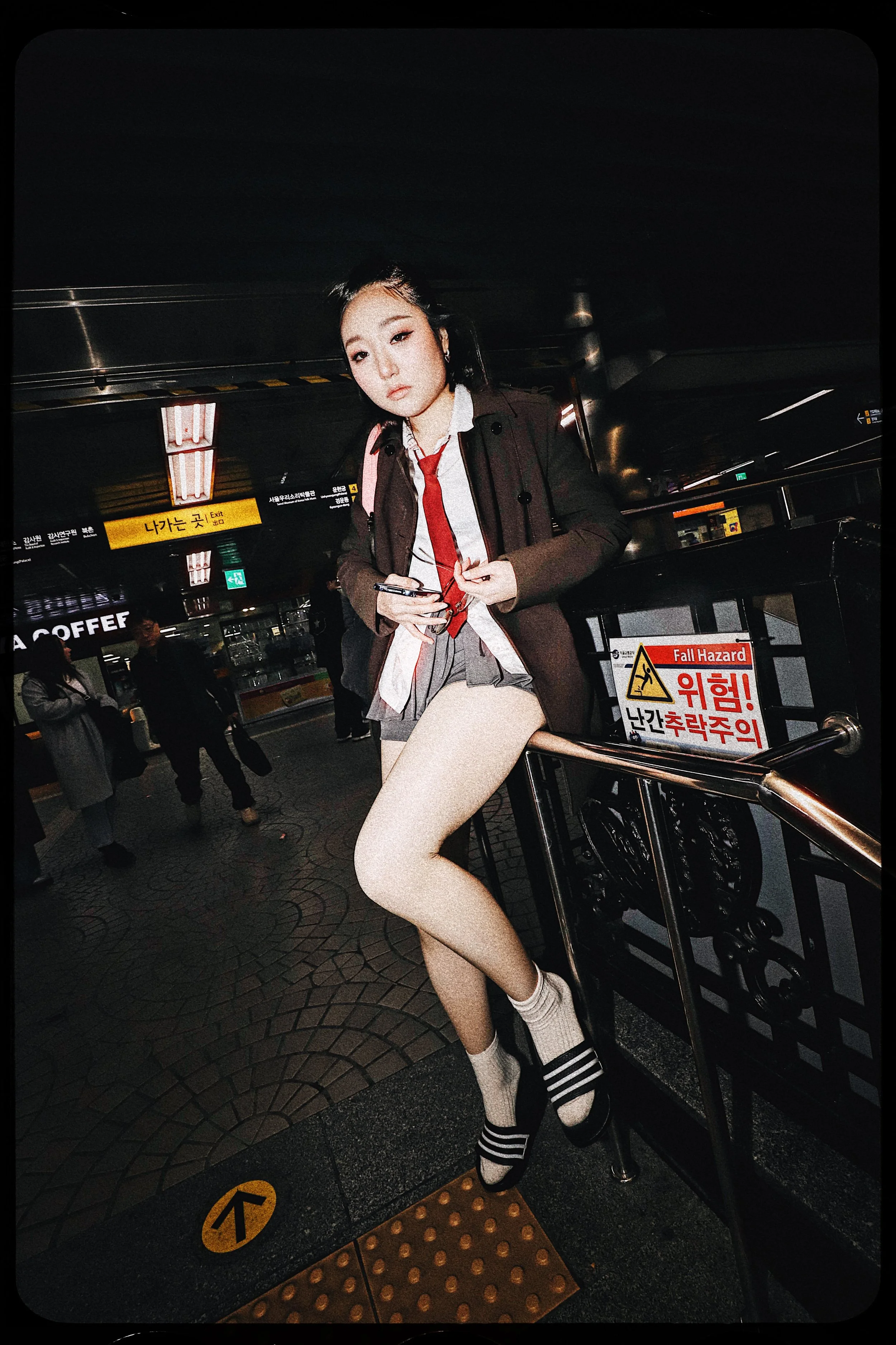 Model @sio_0_show is indeed hazarding a fall in the Anguk subway station on the way out of school.